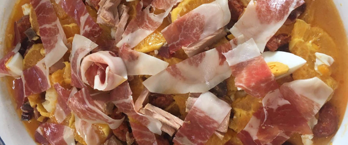 Ensalada Fuentesfrias (Jurel en escabeche, pimiento asado, puerro en salmuera, anchoa, aceitunas, cebolla y huevo cocido)